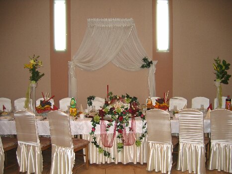Wystrojem sali, dekoracją i oprawą weselną zajmujemy się osobiście przy współpracy z kwiaciarnią"EWA"mieszczącą się w Raszkowie. Mamy dla naszych klientów kilka propozycji kolorystycznych, do których mogą się państwo ustosunkować i wybrać najbardziej odpowiadającą Wam tonację barw, podkreślająca elegancję Waszego przyjęcia weselnego. |
